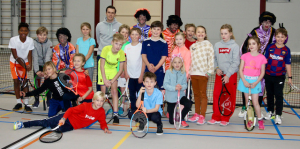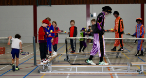 Voor de twee groepen had meester Robin weer leuke spelletjes bedacht. Als warming-up moesten ze het lijnenspel spelen waarbij ze in kleine teams om de beurt pakjes steeds een lijntje verder moesten leggen. Het team dat het eerst bij meester Robin was, had gewonnen. Daarna moesten de kids met een bal op hun tennisracket een heel parcours lopen, om aan het eind de bal in de schoorsteen te laten rollen. Poeh, dat viel nog niet mee voor iedereen. Toen was het tijd om pakjes te schieten. Aan 1 kant van het net stonden allemaal verschillende pakjes en een hulpje die ze de bal aanspeelde. Als de kids een pakje hadden geraakt, kregen ze een punt. Hoewel er best veel en grote pakjes stonden was het nog best moeilijk om er 1 te raken. Bij de laatste groep was er nog tijd om Beat de Piet te spelen waarbij ze om de beurt een rally speelden tegen een Piet. Ze moesten zorgen dat Pieten de fouten maakten, anders waren ze zelf af. Gelukkig hadden de Pieten na afloop voor iedereen nog een zakje met wat lekkers. Het was al met al een gezellige en geslaagde middag. Hopelijk komen ze volgend jaar weer....