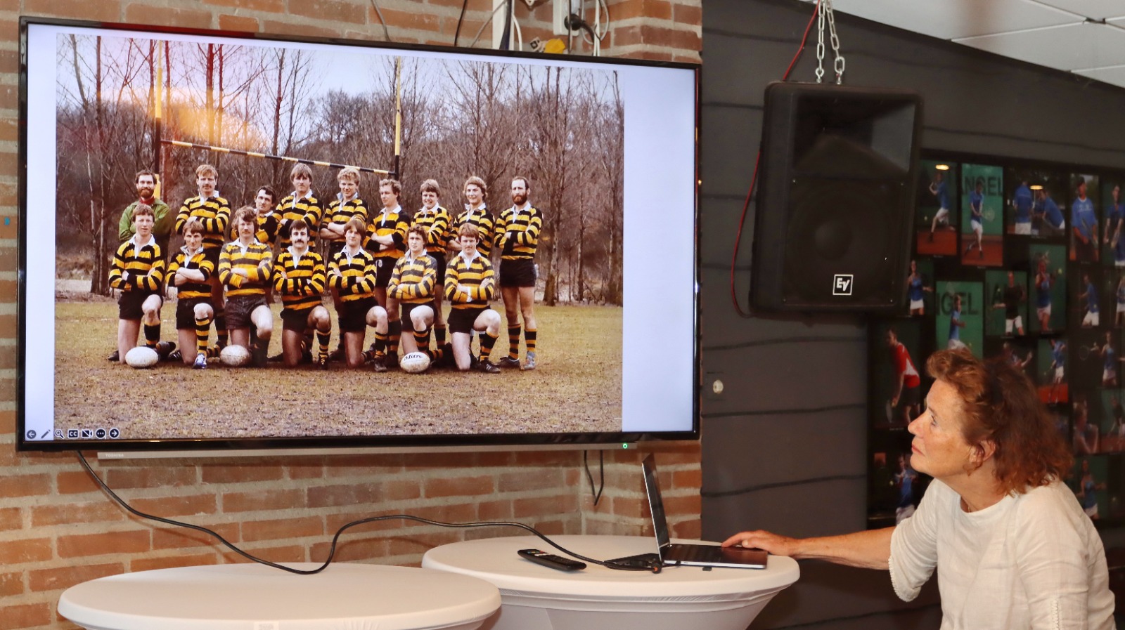 Voorzitter Ronald van der Horst schetste aan de hand van een foto presentatie van de beginperiode tot nu wat Hans voor de vereniging betekende. Vaak zichtbaar als er bij droog weer moest worden gesproeid of zoals bij het laatste Dutch Junior Open wanneer er heel veel banen droog moesten worden gemaakt. Maar ook de onzichtbare kant gesymboliseerd door de aangetaste bureaustoel waar Hans de bestellingen deed. Hans kreeg van TC Bakkum een gezamenlijk afscheidscadeau gedoneerd door leden en oud leden voor een reis voor twee personen naar een Six Nations wedstrijd naar keuze. Van de rugbyers onder de leden van TC Bakkum kreeg Hans een mooi schilderij van een scrum in de sneeuw.